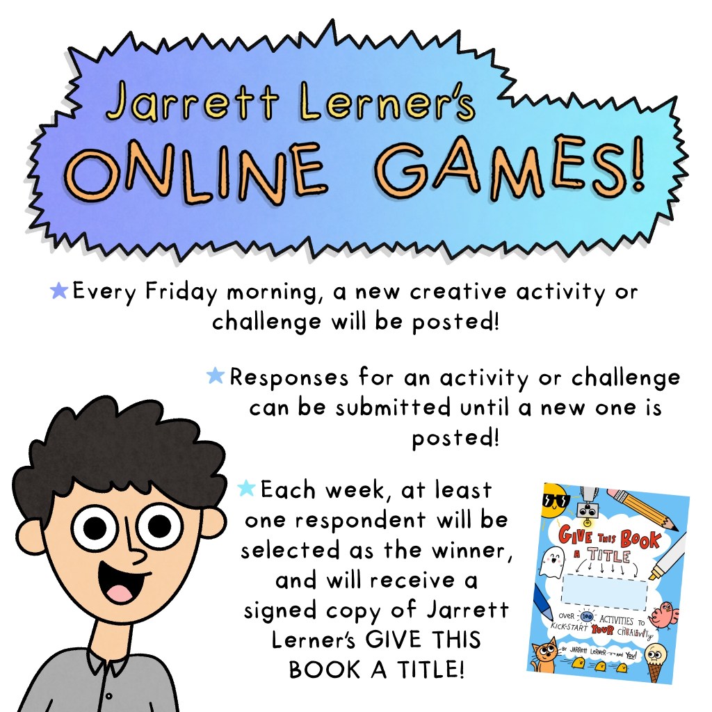 Every Friday morning, I’ll post a creative activity or challenge on my social media platforms: Twitter, Instagram, and Facebook. Responses to the activity or challenge can be submitted as replies to the post itself. (They must be, in fact — I will not read or consider responses submitted by other means.) I will read and consider the properly submitted responses as they come in, and will continue to do so for each activity or challenge until I’ve posted the following week’s activity or challenge. And once I’ve done that, I’ll select and announce the previous week’s winner (or winners, if I decide that more than one response is win-worthy!). The winner will receive a signed copy of my first activity book, Give This Book a Title.