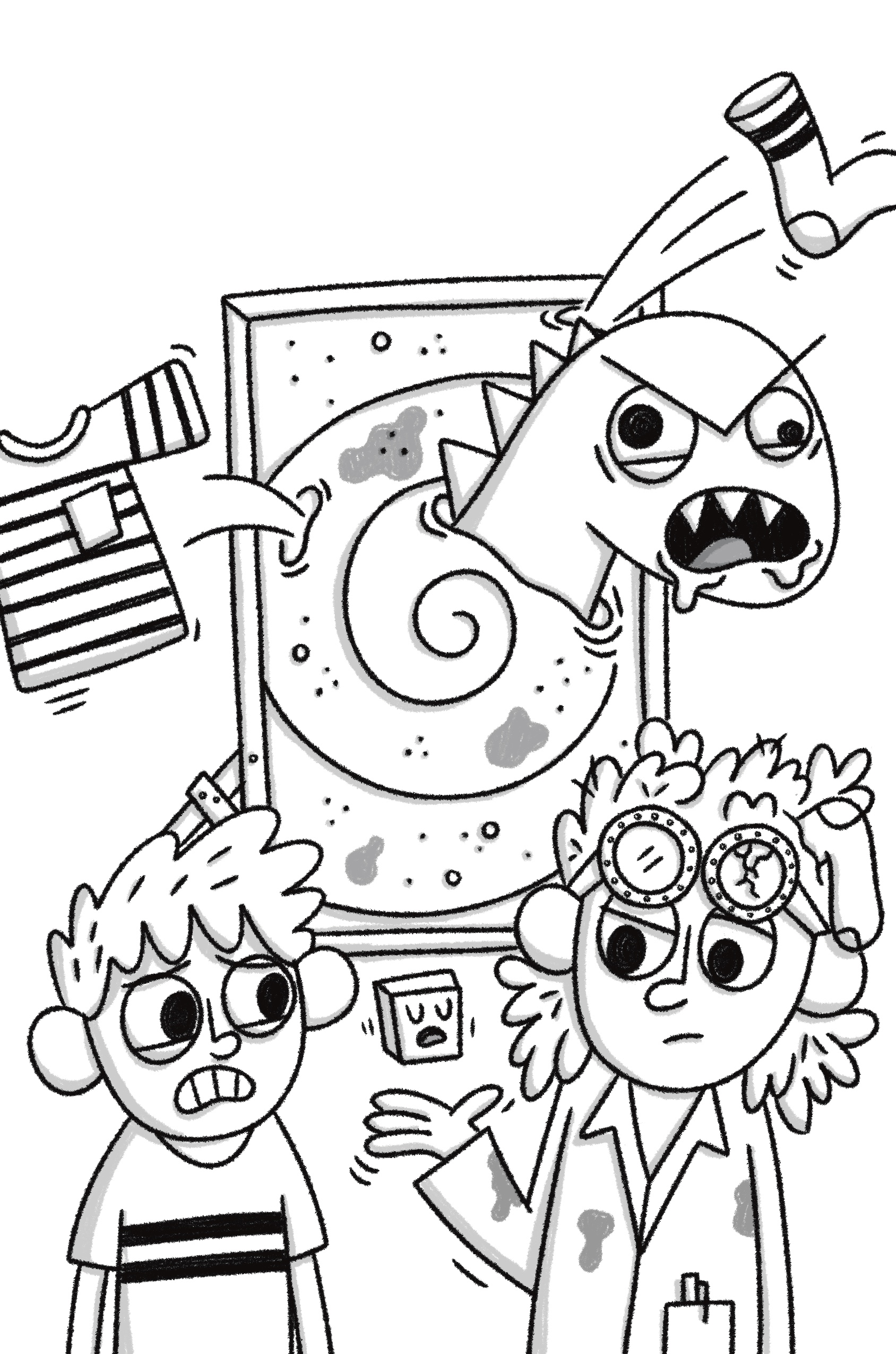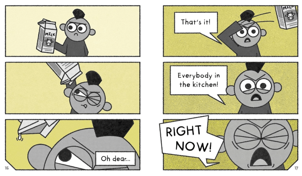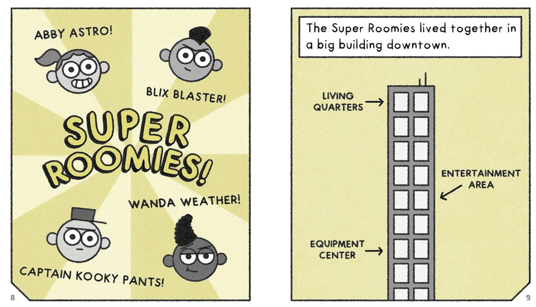 The Super Roomies are superheroes who also happen to be roommates — and not very good ones. In each book, the crew are called upon by their city’s mayor to stop one or another bad guy from committing some sort of reprehensible act, but their roommate-related troubles are always threatening to get in the way of them actually accomplishing their mission. For instance, in Lake of Slime, the deranged Dr. Slimepeople has plans to drain Big City Lake of all its water and replace every last drop with slime, thus making it impossible for the city’s citizens to go swimming. (Like I said: reprehensible.) It’s up to the Super Roomies to figure out just how Dr. Slimepeople is going to do all this draining/replacing and stop him before he can. Which they have plenty of time to do — if, that is, they can stop squabbling about who finished their apartment’s milk and then put the empty carton back in the fridge and stay focused… Below is a sneak peek at some spreads of the book’s interior.