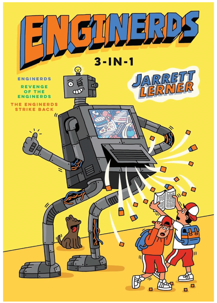 One week after all of that — on May 12th — my fourth book of the month hits shelves: another bind-up, this one of my first-ever series of books, EngiNerds. When I learned that my publisher wanted to rerelease these books in this form, I was beyond delighted. The EngiNerds series is comprised of three Middle Grade novels, all of them just under 200 pages and featuring fun, funny, fast-paced storytelling. For all kinds of reasons, books at this length and with such so-called “high-interest” content are needed now more than ever, and I am so excited that this bind-up will introduce a new generation of readers to the EngiNerds and their epic showdowns with a fleet of bottomlessly hungry, aggressively flatulent robots.