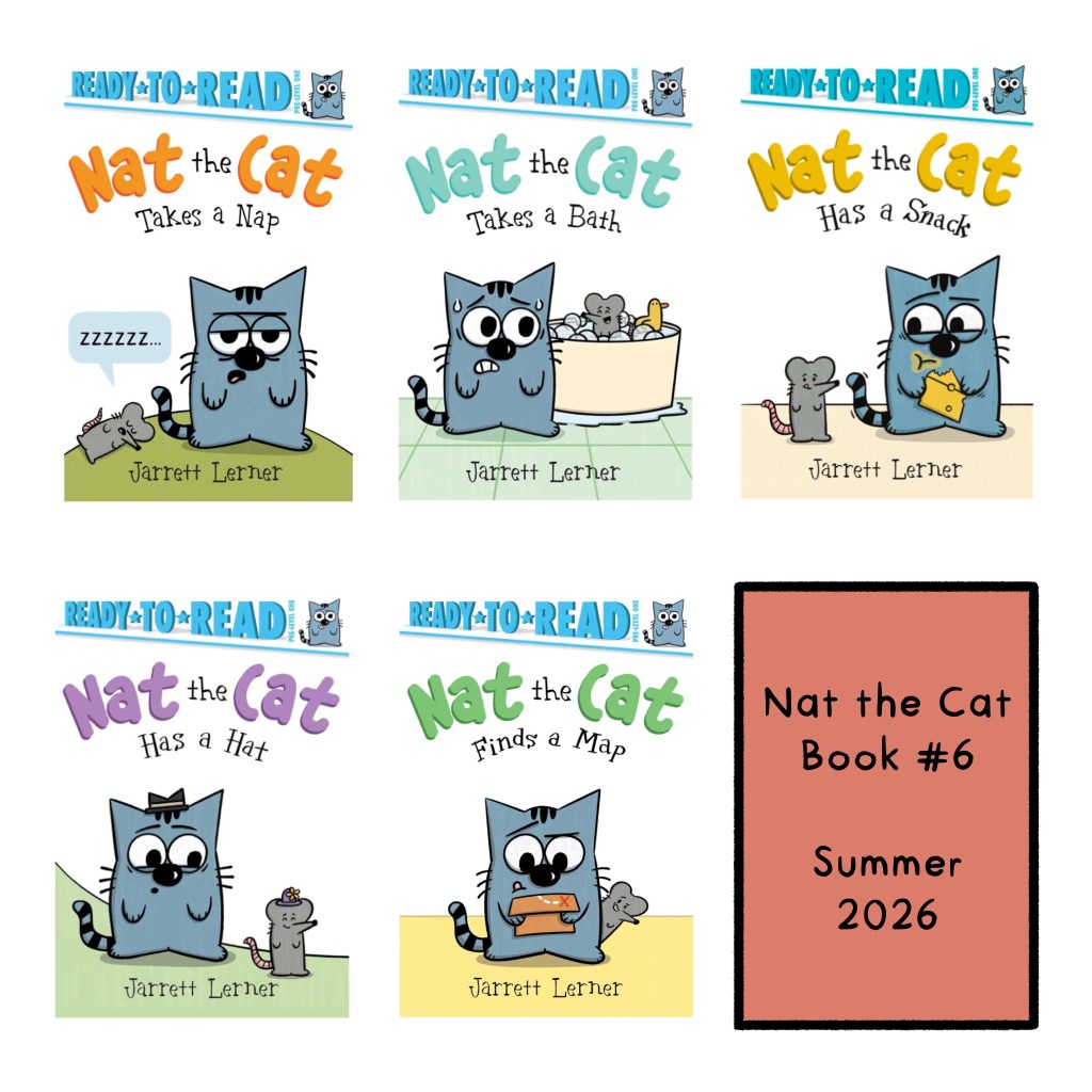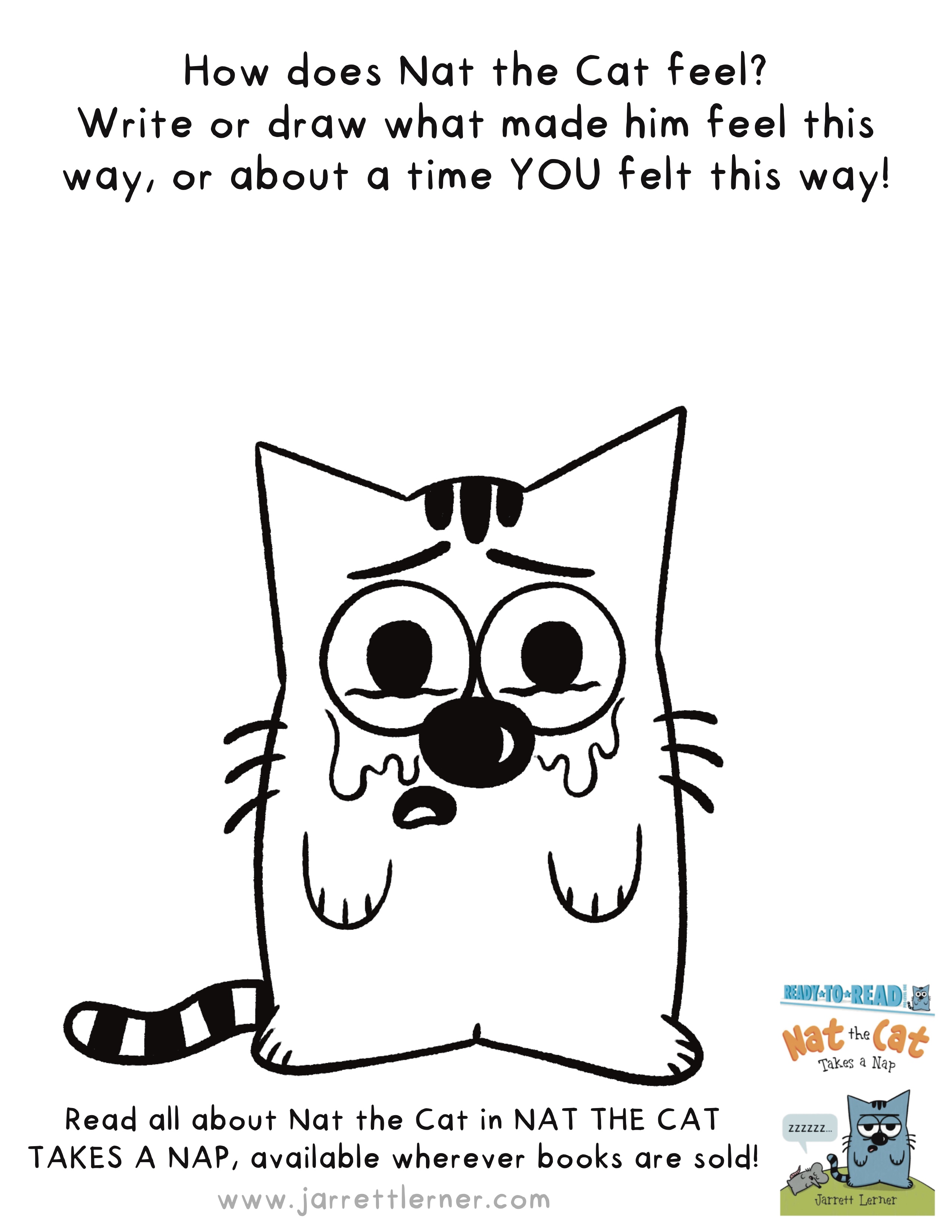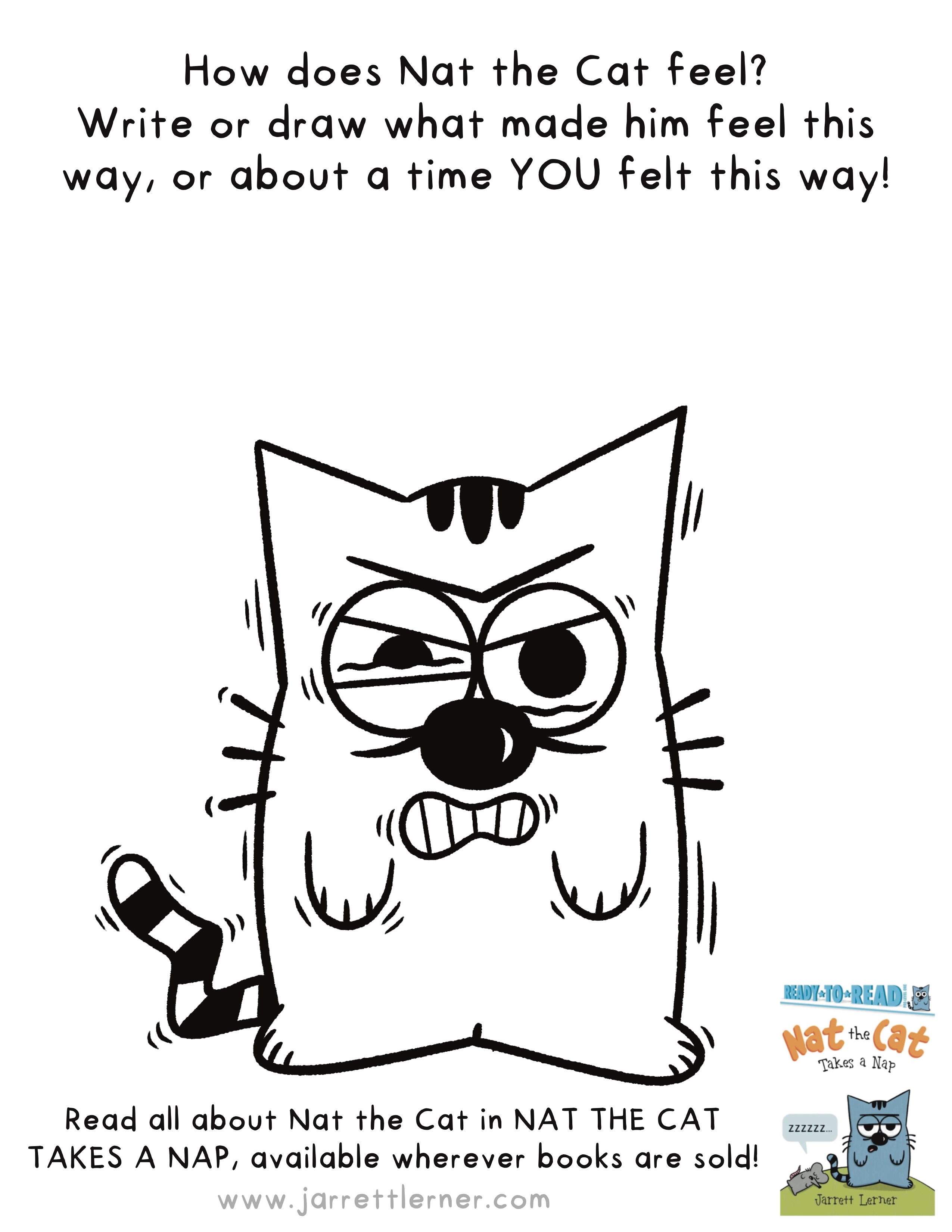 Nat the Cat is the star of Jarrett Lerner’s first early reader series! You can read about him and his pal, Pat the Rat, in Nat the Cat Takes a Nap, Nat the Cat Takes a Bath, Nat the Cat Has a Snack, and Nat the Cat Has a Hat. Below you can find a handful of Nat the Cat activity sheets. Kids can use them as coloring pages, or do the activities suggested at the top. Enjoy!