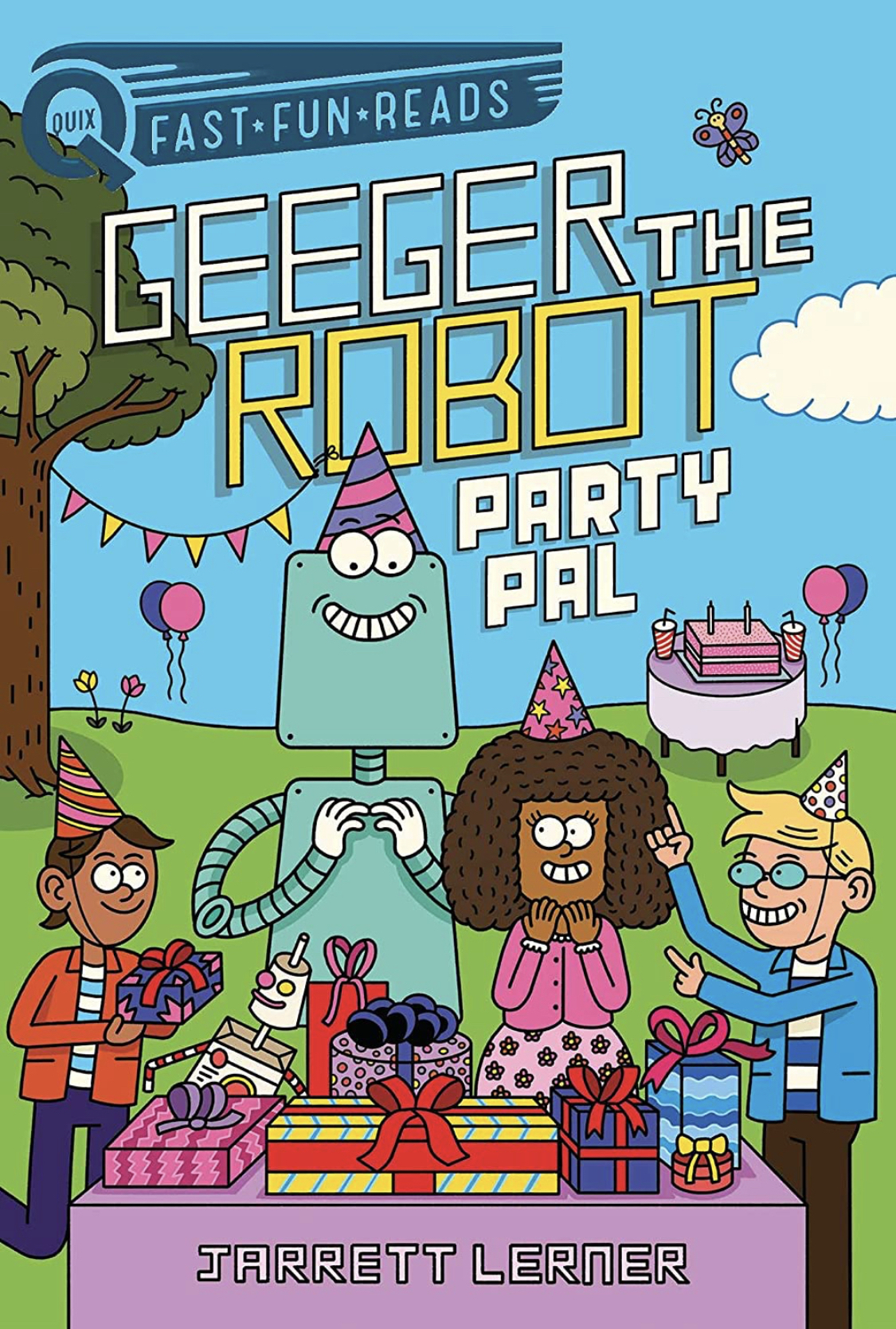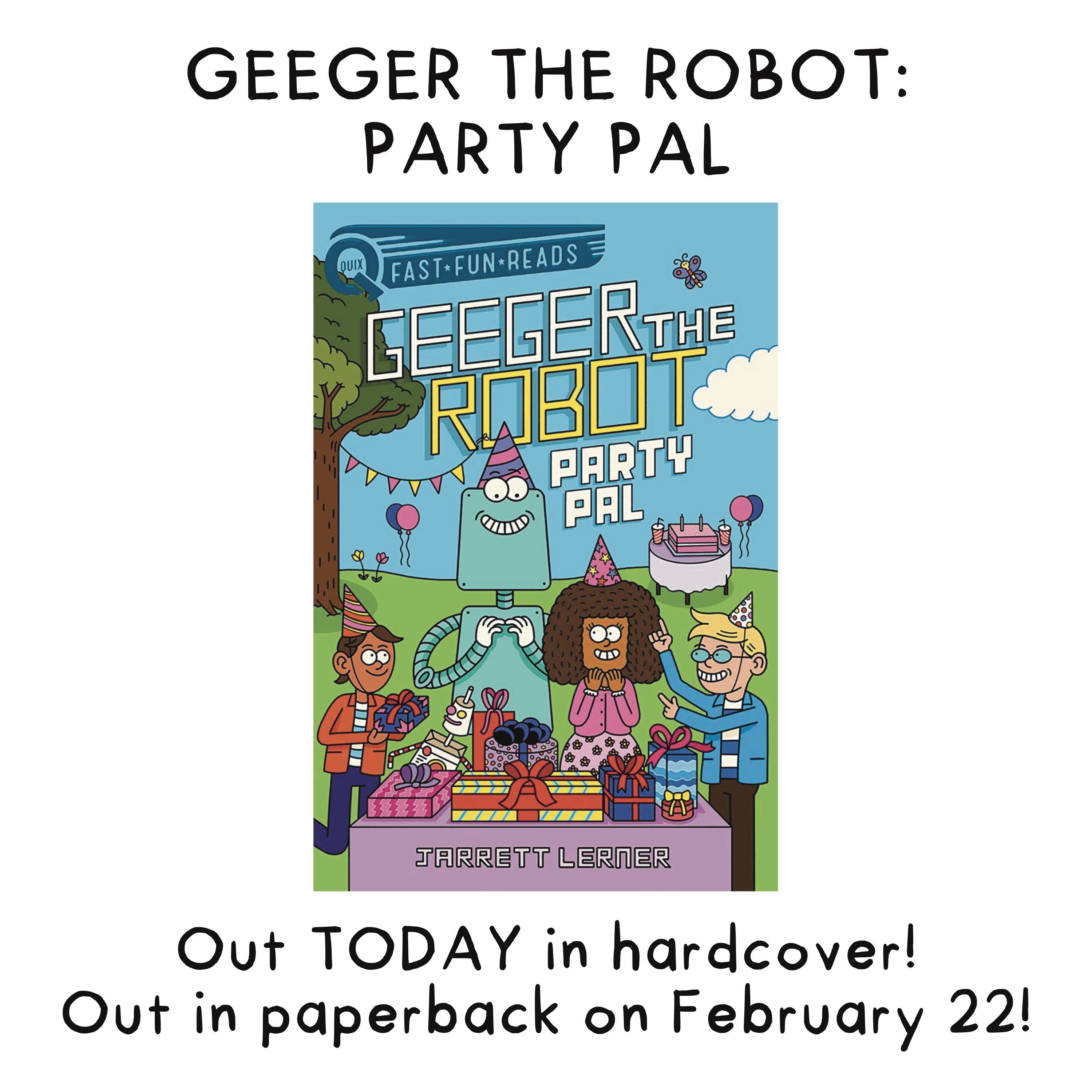 If you preordered the hardcover version of Geeger the Robot: Party Pal, you should be getting your copy today. Starting today, you’ll also be able to find the hardcover version of the book wherever books are sold. The paperback version, however, is slightly late to the party. Three weeks late, to be exact — which, in the publishing world, really is only a slight delay. If you preordered a copy of Party Pal, you can expect it on February 22nd. And starting that day, you’ll also be able to find the paperback version wherever books are sold. See below to learn a bit more about this fourth book in the Geeger the Robot series. And to learn more about the other books in the series, head to the Geeger the Robot page of this website (or click here).